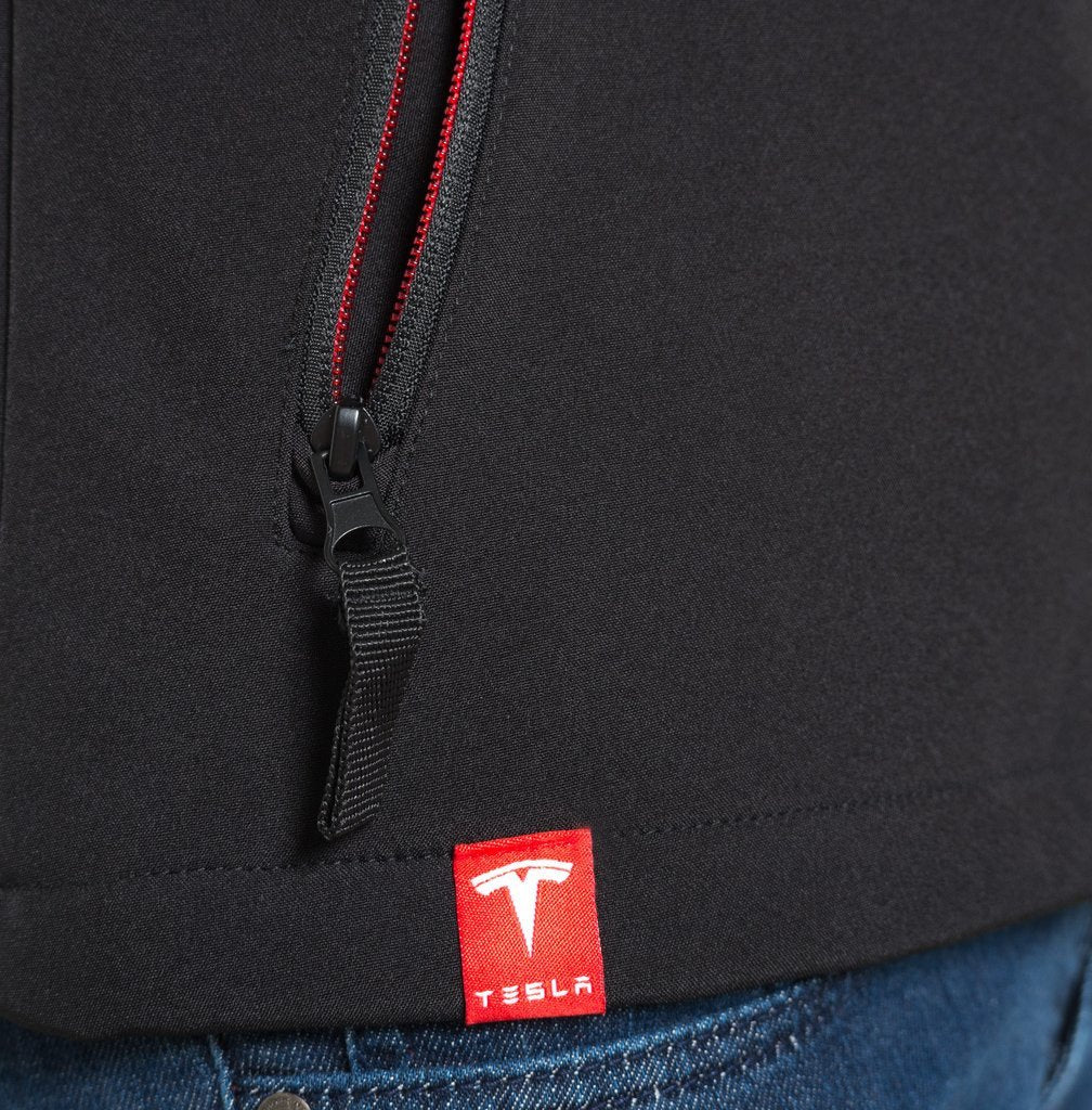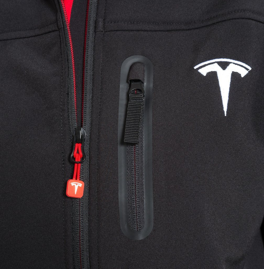 The Tesla Corp jacket is fully customized and uniquely styled. 94% polyester, 6% elastane, this jacket has the front 'T' embroidered on left chest and Tesla wordmark embroidered across the back. Center front closure with storm flap. Custom logo 'T' zipper pulls. Zip chest pocket with bonded tape styling. Adjustable drawstring system at hem. MP3 cord holder. Inside pocket.